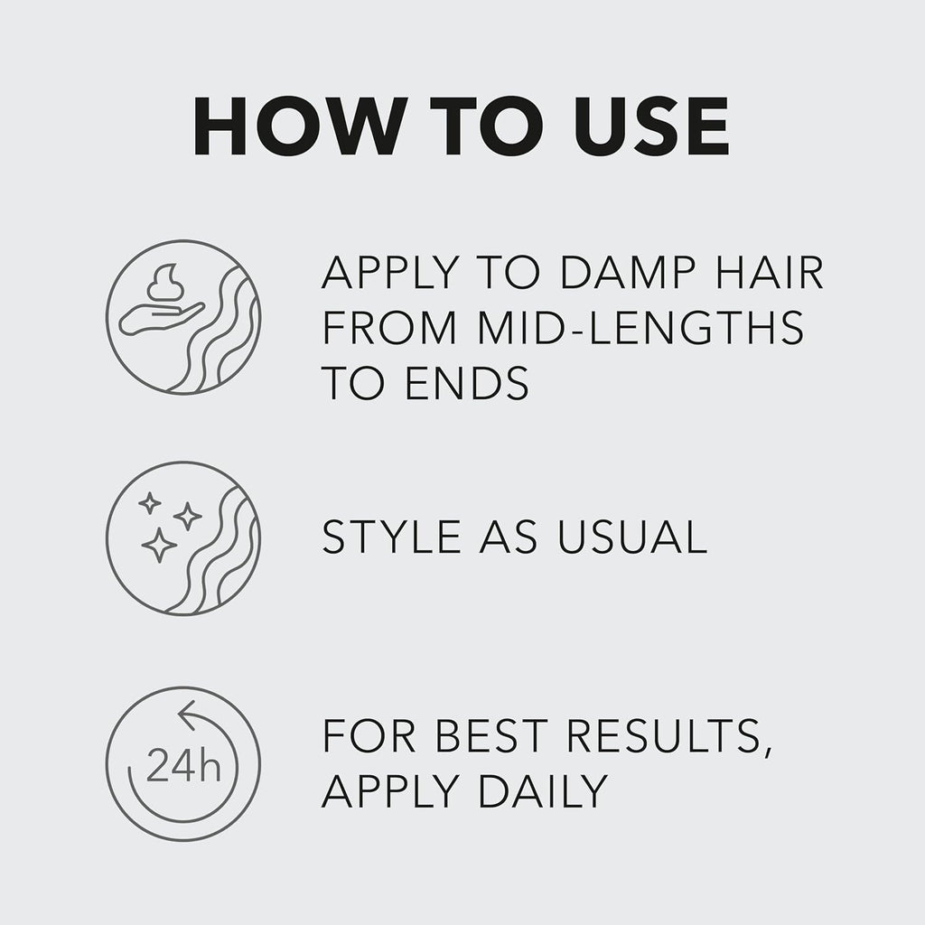 - Apply a small amount to clean, damp hair, focusing on the mid-lengths and ends.