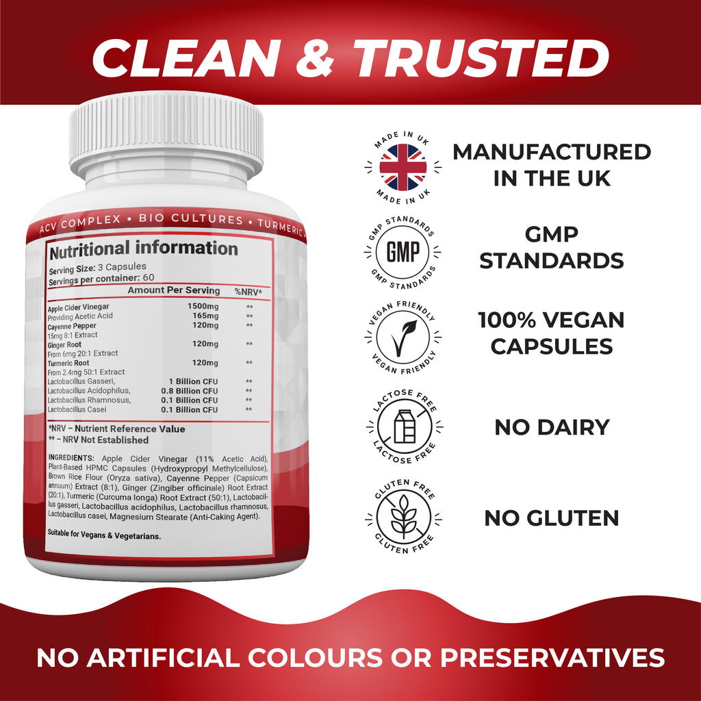 INGREDIENTS: Apple Cider Vinegar (11% Acetic Acid), Plant-Based HPMC Capsules (Hydroxypropyl Methylcellulose), Brown Rice Flour (Oryza sativa), Cayenne Pepper (Capsicum annuum) Extract (8:1), Ginger (Zingiber officinale) Root Extract (20:1), Turmeric (Curcuma longa) Root Extract (50:1), Lactobacillus gasseri, Lactobacillus acidophilus, Lactobacillus rhamnosus, Lactobacillus casei, Magnesium Stearate (Anti-Caking Agent).